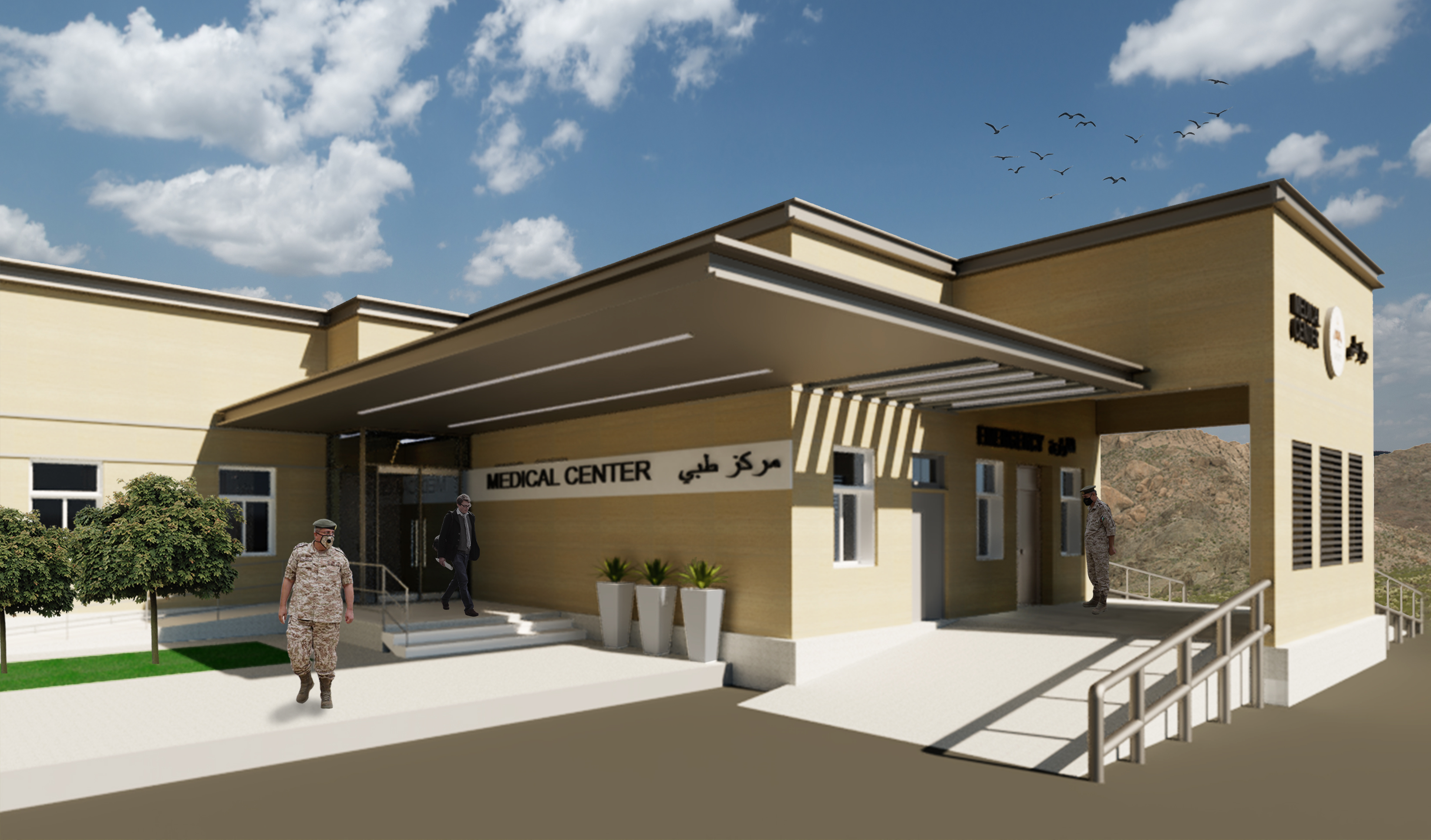 For the purpose of upgrading the Medical Center at Abdullah II Special Operations Training Center (KASOTC), OMB carried out a full re-design of the interior spaces and face lifting of the exterior elevations including adding an entrance canopy and adjusting the emergency entrance and ambulance canopy.