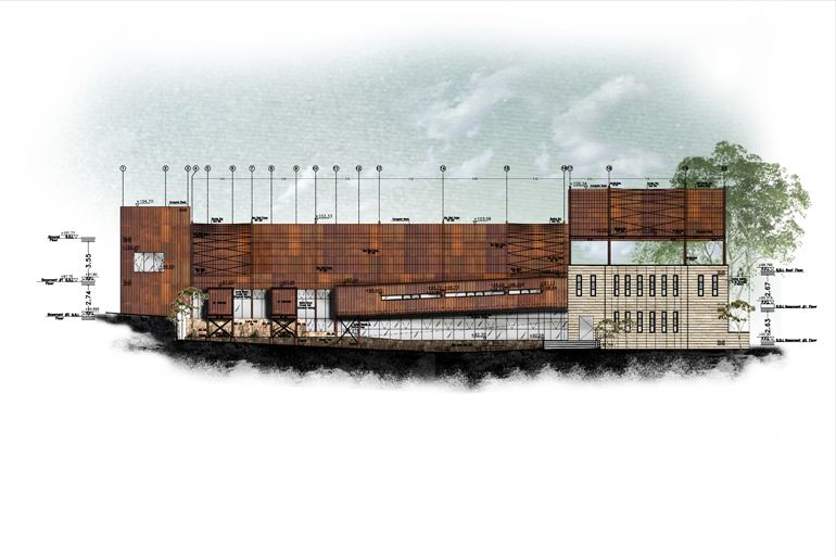 Handicapped access is offered by means of an elevator and ramps that take visitors all through exhibition spaces and allowing views to the valley and stream and offering visual interaction between visitors in various spaces.
